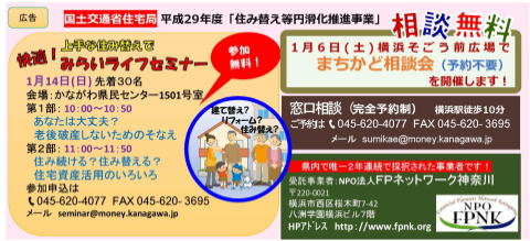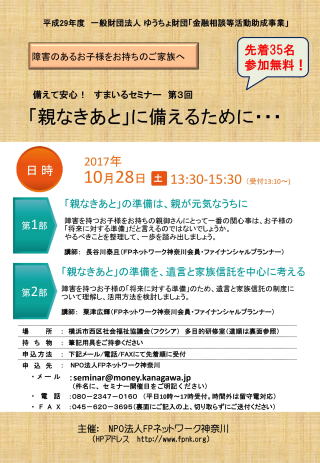 平成29年度 一般財団法人 ゆうちょ財団「金融相談等活動助成事業」の助成金をいただき、NPO法人FPネットワーク神奈川主催の無料セミナー「備えて安心! すまいるセミナー」を開催します。