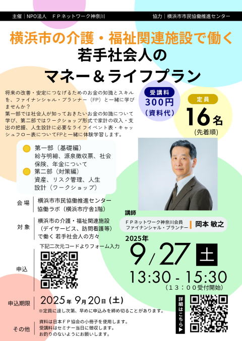横浜市の介護・福祉関連施設(デイサービス、訪問看護等)で働く若手社会人の方々を対象(※)とする「若手社会人のマネー&ライフプラン」セミナーを、NPO法人FPネットワーク神奈川が開催いたします。