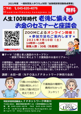 FPネットワーク神奈川では、2021年度ゆうちょ財団「金融相談等活動助成事業」として、2021年7月10日(土)、Zoomによるオンラインの『人生100年時代 老後に備えるお金のセミナーと座談会』を開催させていただくことになりました。