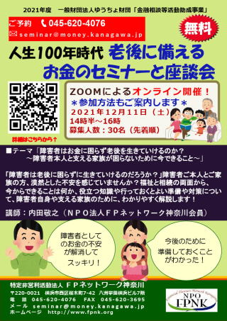 FPネットワーク神奈川では、2021年度ゆうちょ財団「金融相談等活動助成事業」として、2021年12月11日(土)、Zoomによるオンラインの『人生100年時代 老後に備えるお金のセミナーと座談会』の第3回(全4回)を開催いたします。