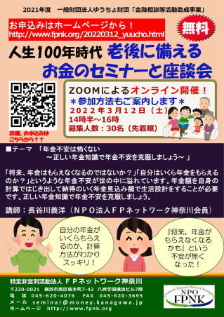 『人生100年時代 老後に備えるお金のセミナーと座談会(第4回)』のご案内(オンライン開催)